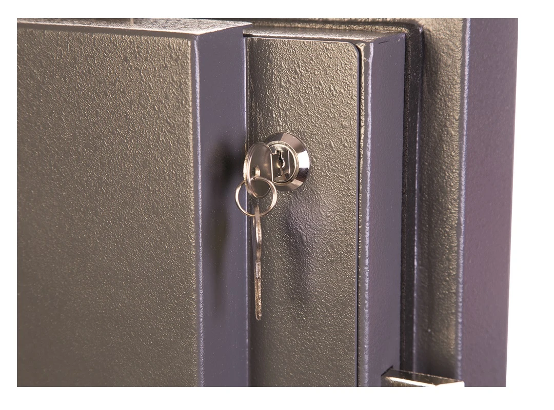 - Сейф HS9073E оборудуется четырёхсторонним ригельным механизмом, представленным девятью прямоугольными стальными ригелями 100×10 мм – выдвигающимися с трёх сторон, а также пассивными (неподвижными) со стороны петель.